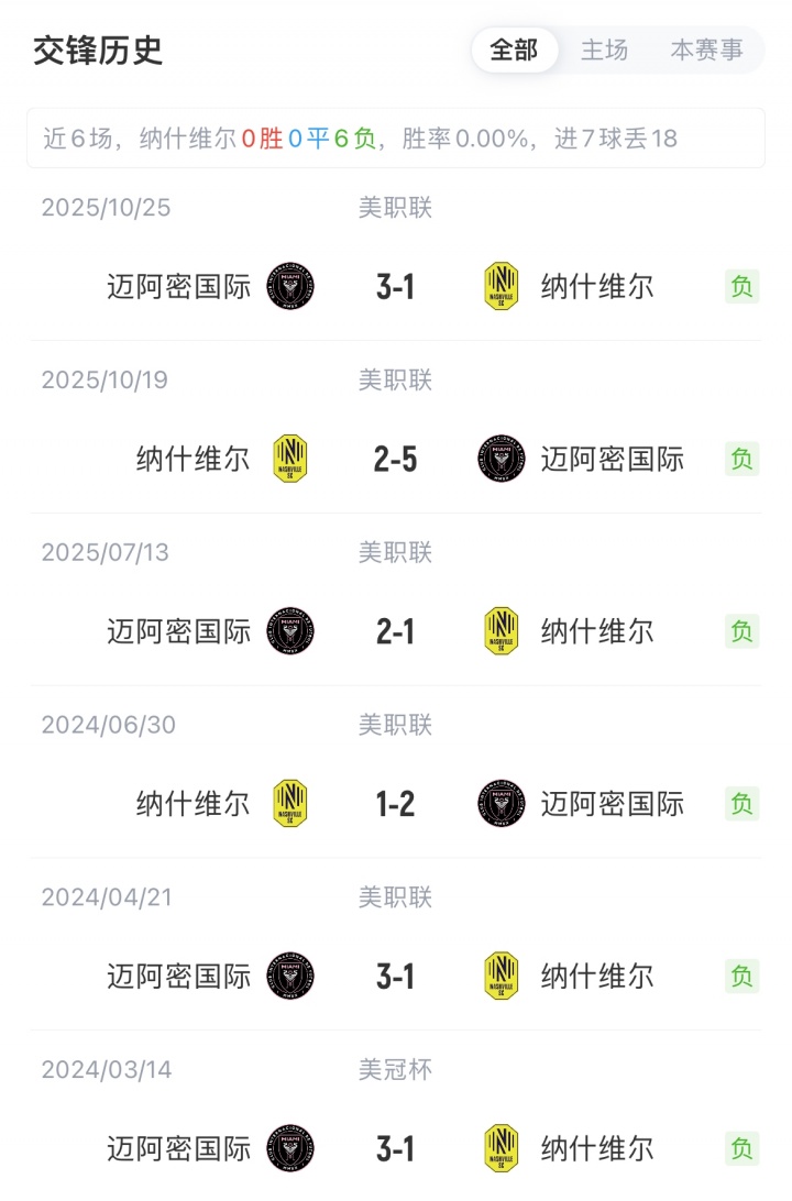 迈阿密国际联赛19胜8平7负积65分位列东区第3,目前已获4连胜;纳什维尔联赛16胜6平12负积54分位列东区第6,近3场不胜。迈阿密国际对阵纳什维尔已6连胜。