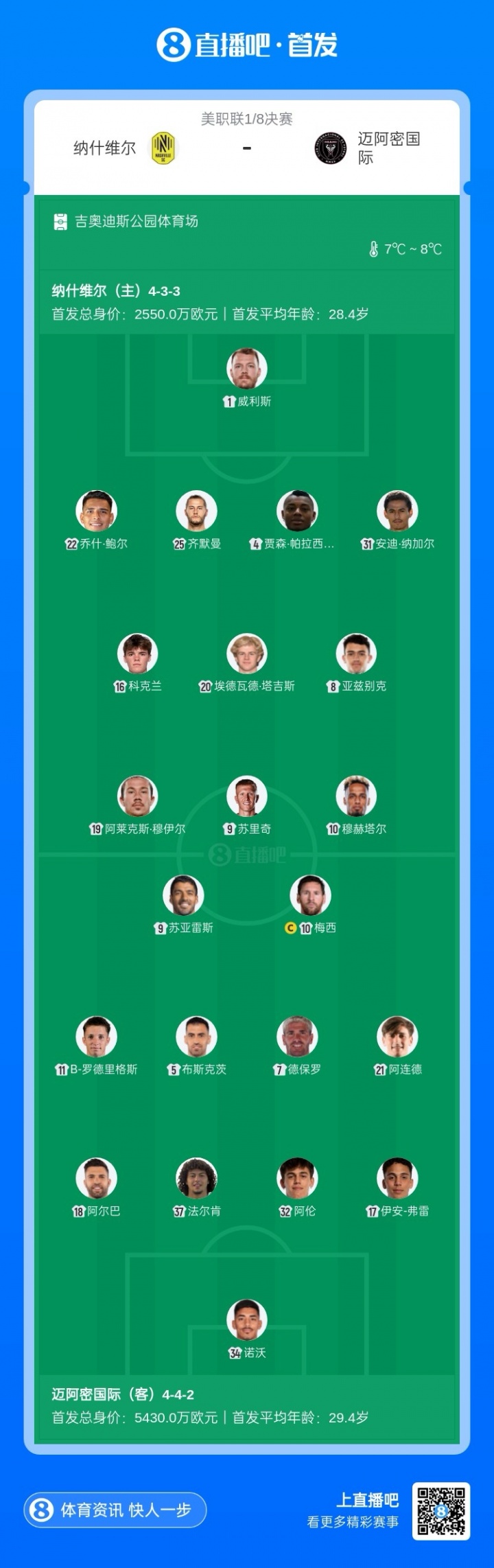 11月02日讯 美职联1/8决赛,迈阿密国际客战纳什维尔,赛前双方首发公布。