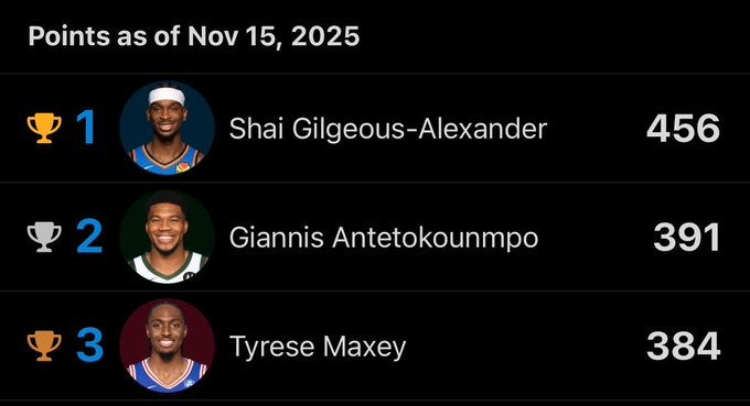 2025-11-16 16:11:32本赛季总得分前3:亚历山大456分大幅领先 字母哥马克西分列二三