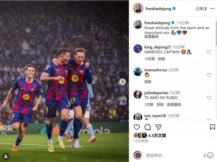 2025-11-10 08:01:07染红离场!德容社媒庆祝取胜:球队展现很棒的态度,收获重要胜利